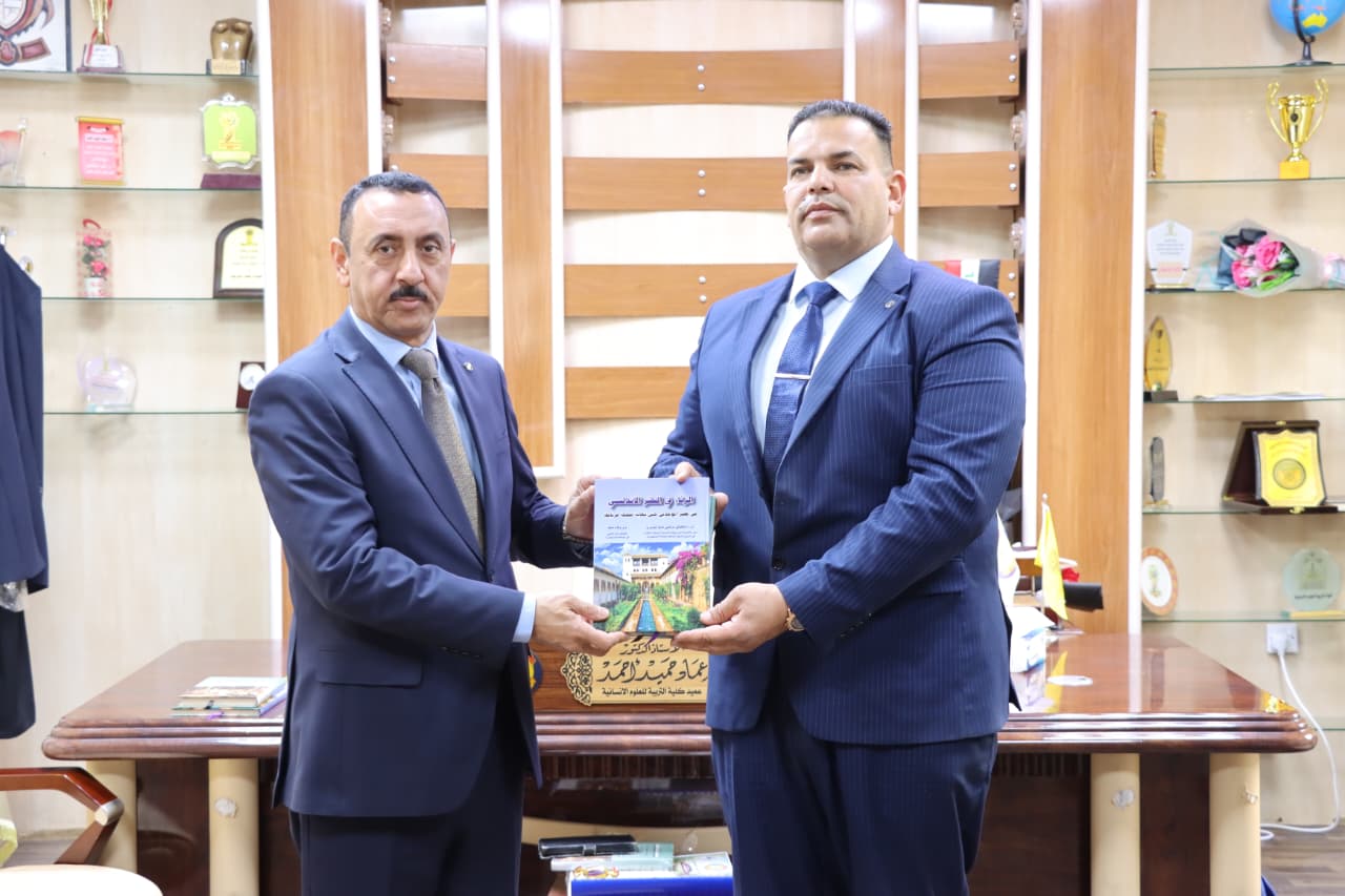 At the conclusion of the meeting, the President of the Andalusian–Morisco Academy presented a scholarly gift to the Dean of the College in the form of a book authored by him entitled “Elegy in Andalusian Prose.” In return, the Dean of the College of Education for Humanities, Prof. Dr. Imad Hamid Ahmed, presented the President of the Academy with a book he authored entitled “Linguistic Studies in Qur’anic Readings.”