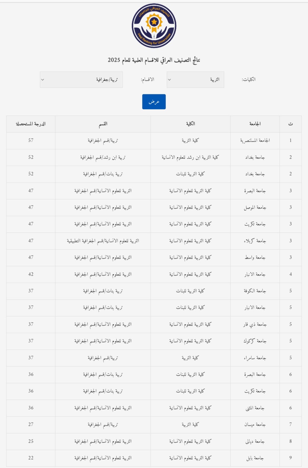 According to the classification results, the Department of Geography ranked third nationwide among all Geography departments at Iraqi universities, an achievement that reflects the department’s outstanding scientific and academic performance. In addition, the other departments of the College also attained advanced rankings, confirming the academic rigor and continuous efforts exerted by the College’s teaching staff.