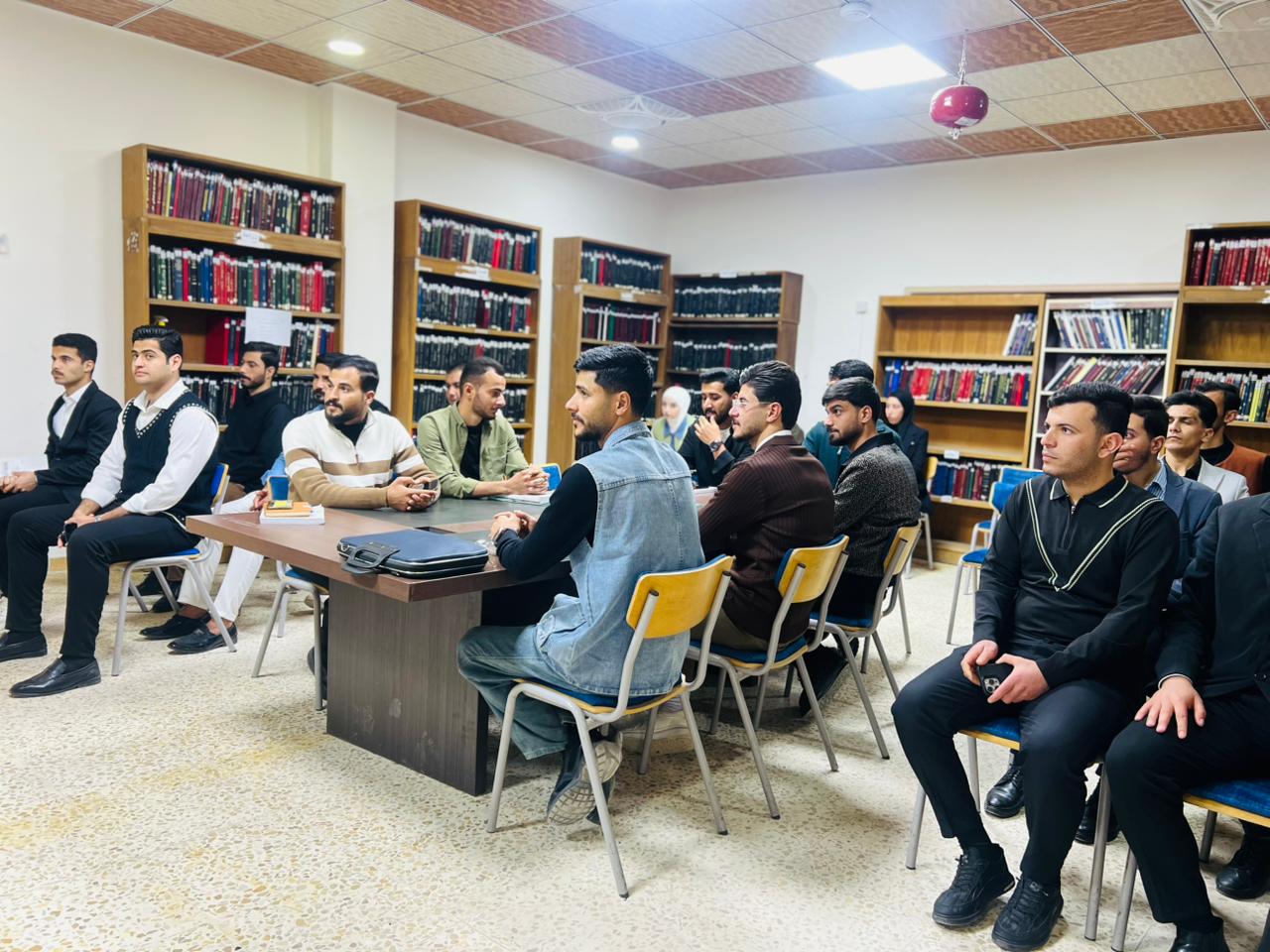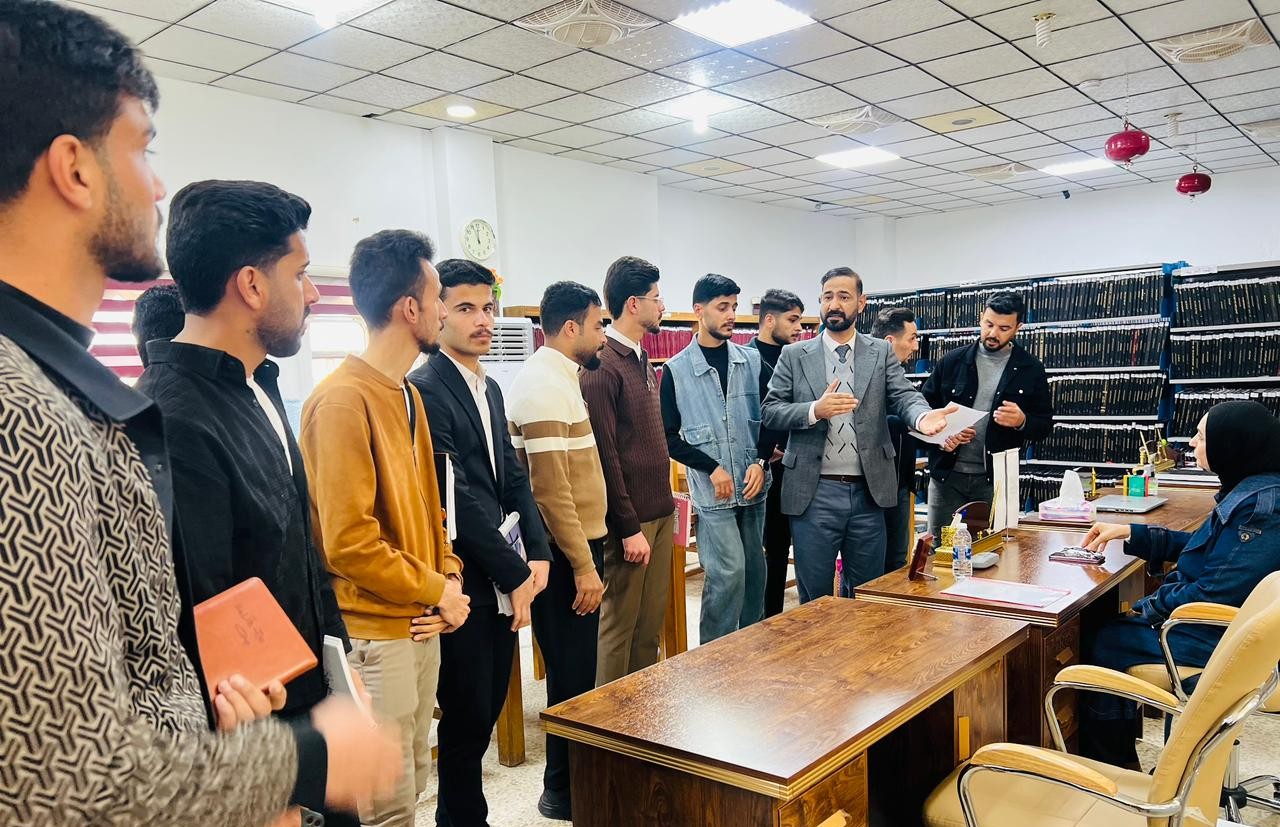 The visit included an introductory overview of the nature of the Library’s work, the resources and books it houses, as well as an explanation of the procedures for borrowing books and the services provided to students and researchers. The visit also aimed to familiarize students with the types of available resources and the methods of searching for and utilizing them in their academic studies and research.